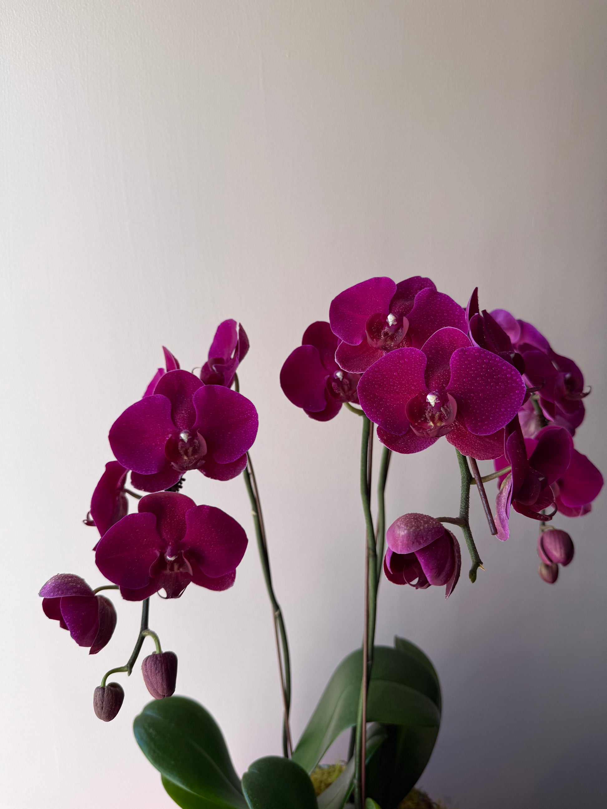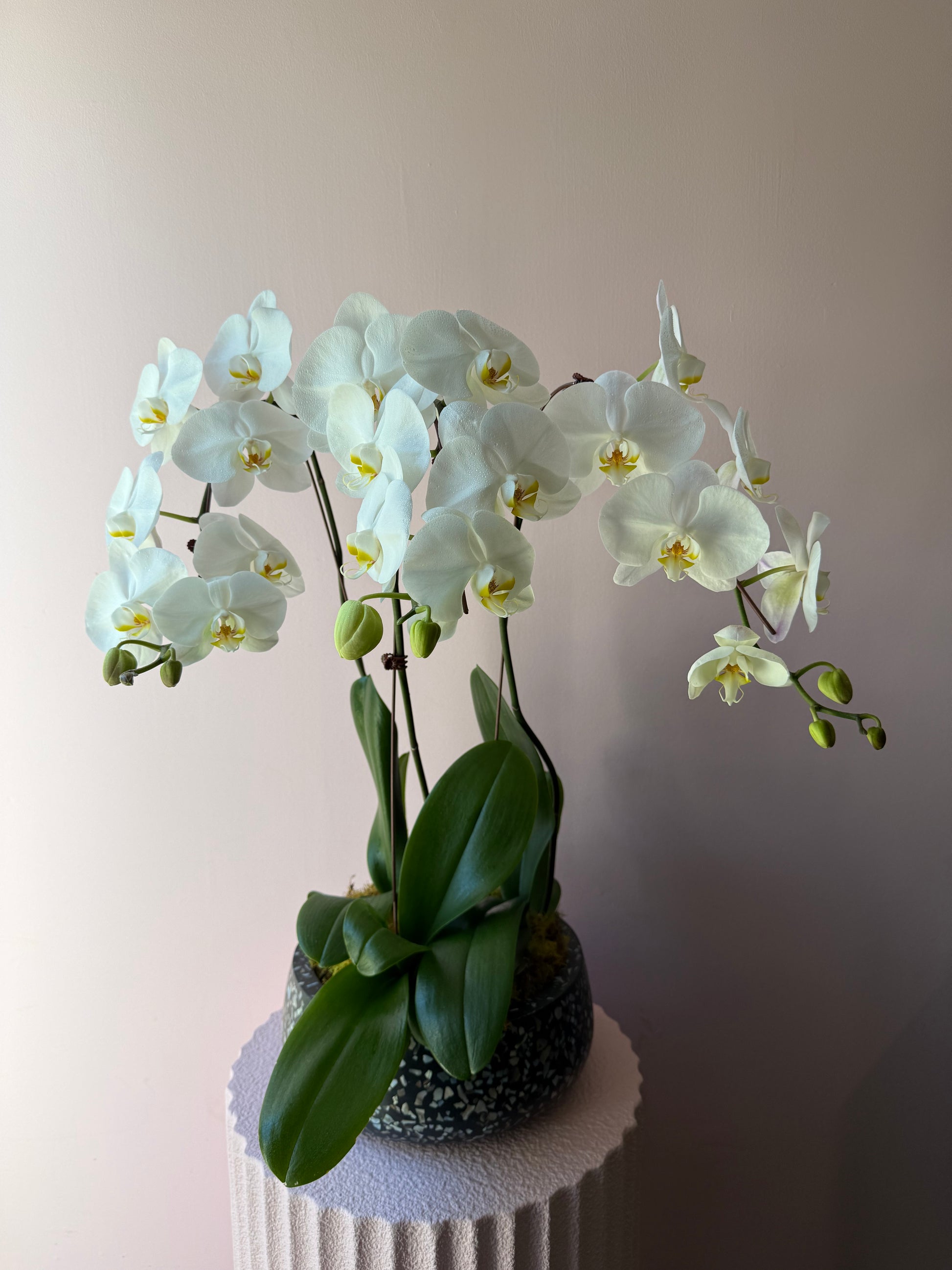 Embrace the exquisite elegance of our Potted Phalaenopsis Orchid Trio, a symbol of sophistication and grace. These premium locally grown Phalaenopsis Orchids are gracefully nestled in a Syracuse pot dressed with fresh forest moss. The Syracuse pot exudes elegance and class with its unique inclusion of crushed seashells. Available with white or purple Orchids.