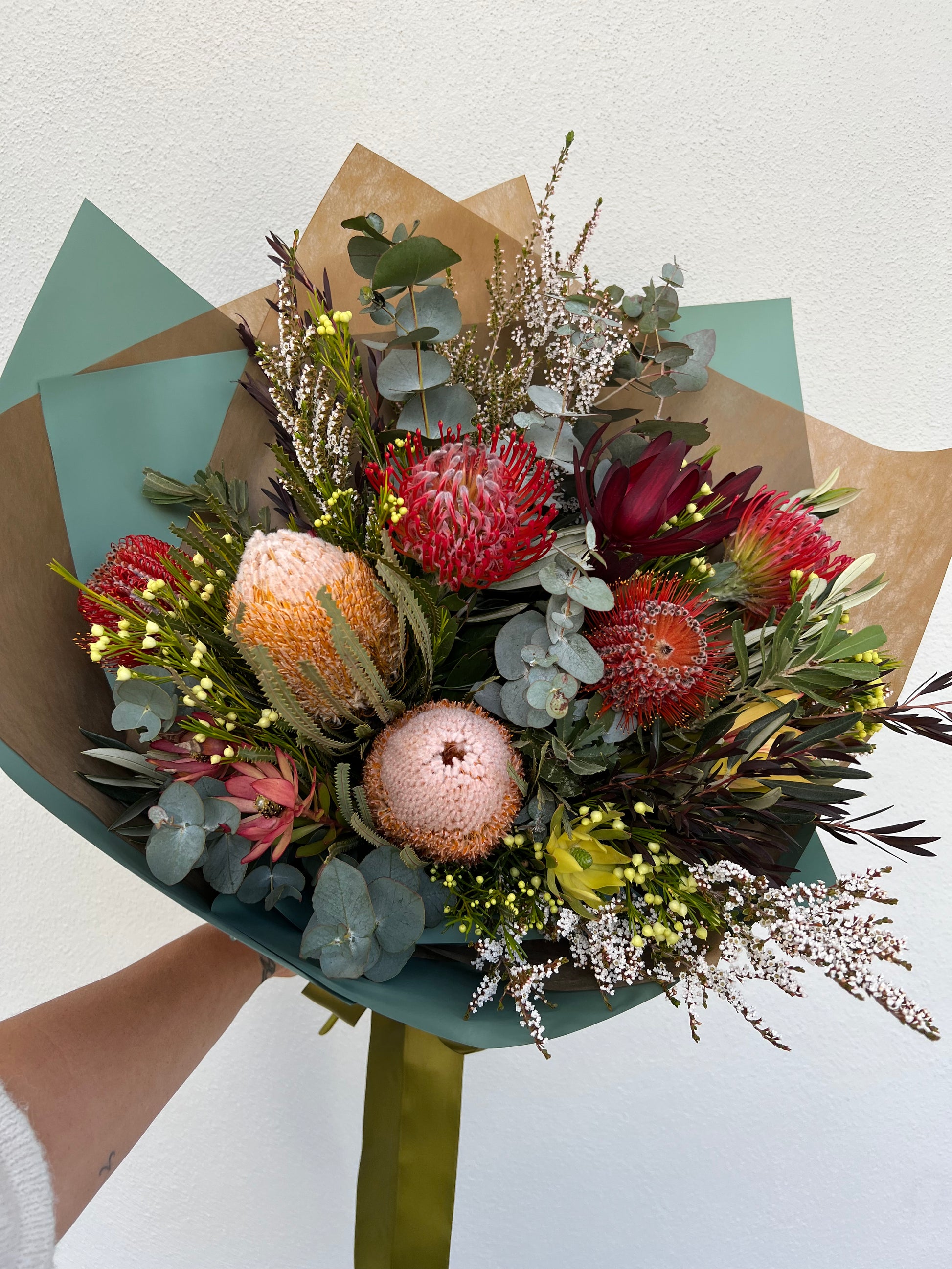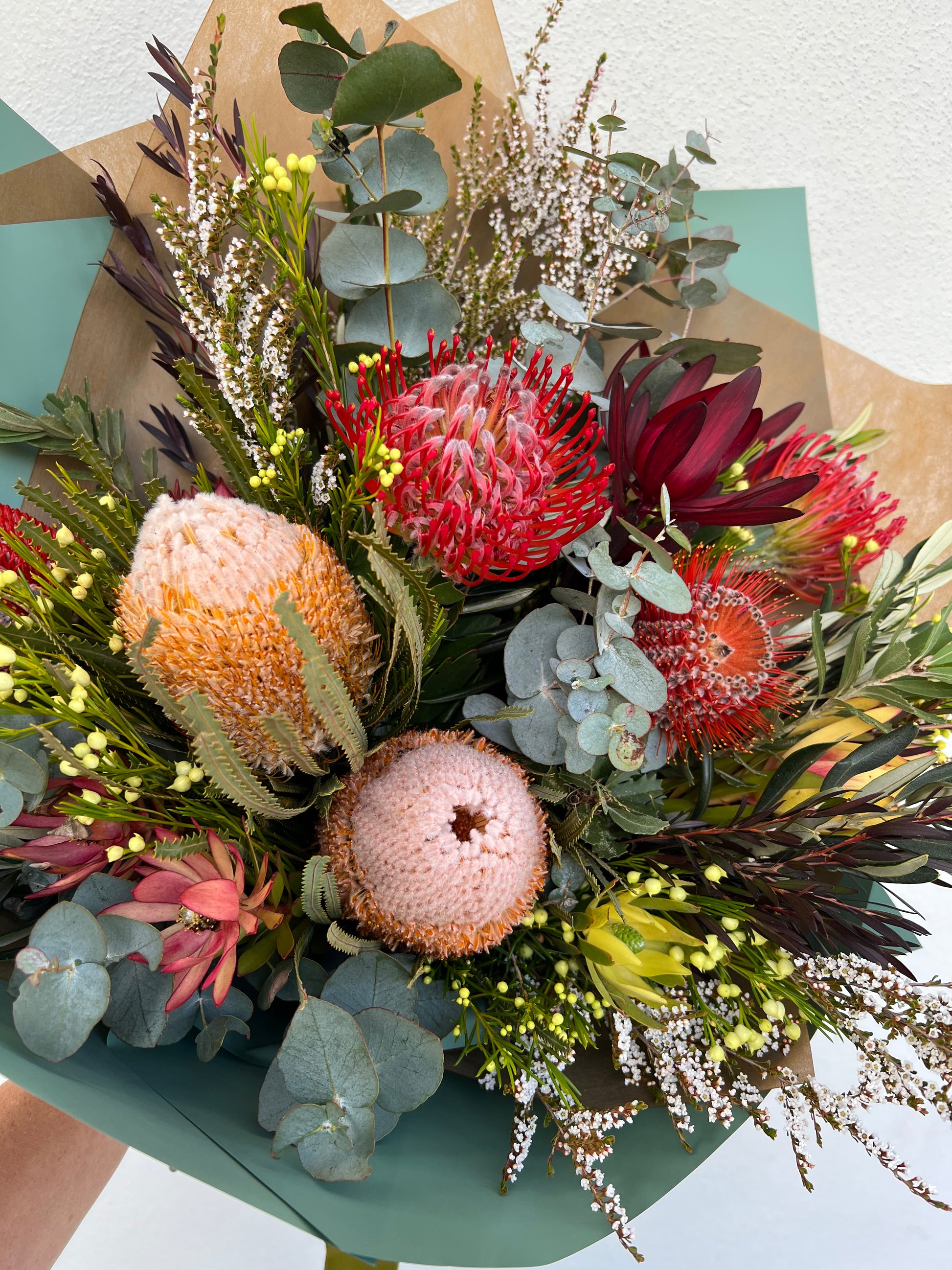Celebrate the untamed beauty of Australia with this exquisite wildflower arrangement, featuring a carefully curated selection of native blooms.